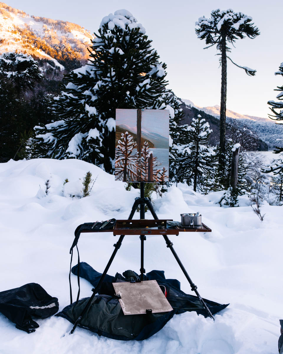 La siguiente imagen que llega es de la pintura que hizo arriba, “en plein air”: unas araucarias nevadas y el tronco viejo de una lenga muerta. Tiene oscuridad y tiene luz, esa luz menguante del atardecer en las cumbres. Es una luz lejana, agotada, atrapada en el pasado: las nieves rosadas del fondo no saben que en cuestión de segundos no habrá más color.